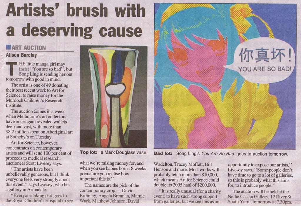 オーストラリアの大衆紙、ヘラルドサンは27日の芸術欄において 7月28日サウスヤラで開催されるチャリティーオークションに出品される 芸術作品とアーティストを紹介した。 ポップ調の少女が"YOU ARE SO BAD!"と言い放っているこの絵は 現代芸術家ソン・リンの作品である。 この他にもオークションにはマーク・ダグラスら現代芸術家達の 作品が出品され、これらの大半は1万豪ドル(約100万円)以上で 落札される予定である。 痛いニュース(ノ∀`):【現代芸術】 中国人アーティストが加工した「ハルヒ」の絵が100万円で落札 いろんな意味で泣けた記事だった…。 元になったハルヒ画像(角川公式) http://www.kadokawa.co.jp/sp/200603-04/img/sub03.jpg 同じくらいの位置で切ってみた。 PR |